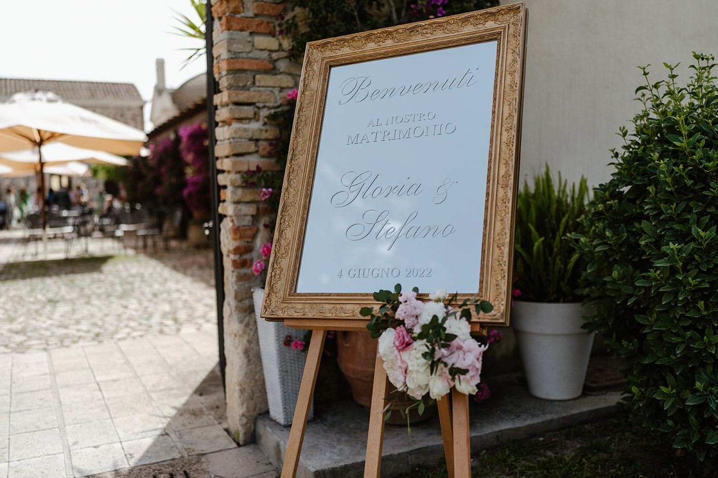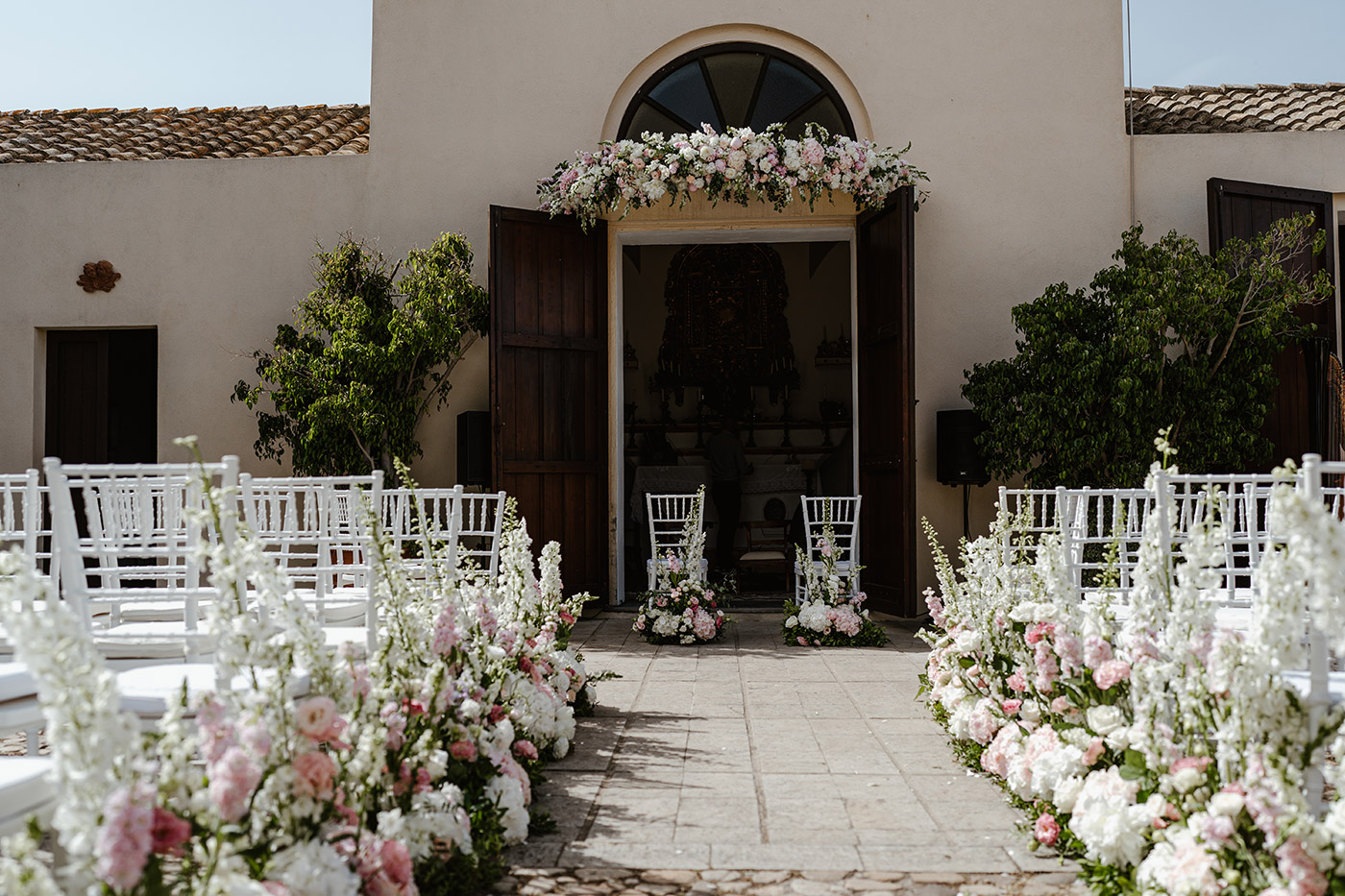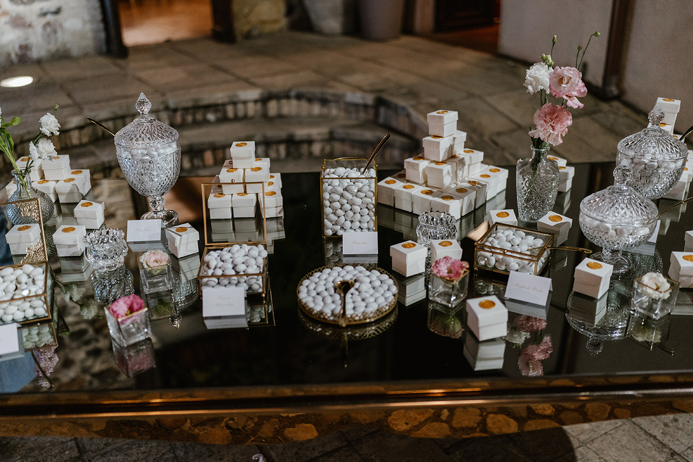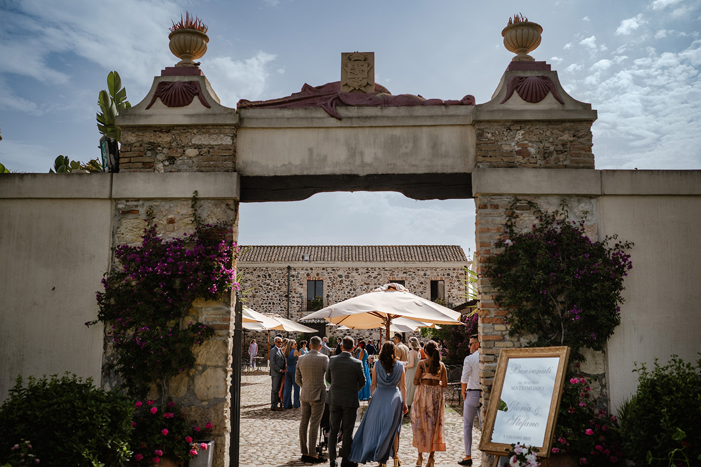 La cerimonia religiosa si è svolta nella cappella intima della tenuta, seguita da un elegante aperitivo nel giardino e da una cena raffinata nella sala interna.