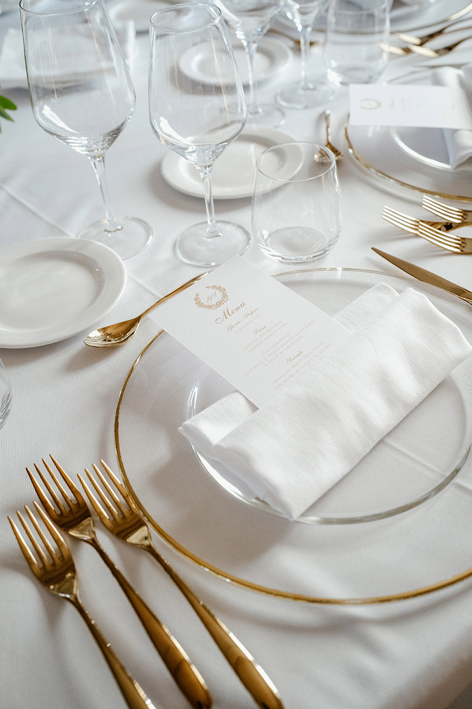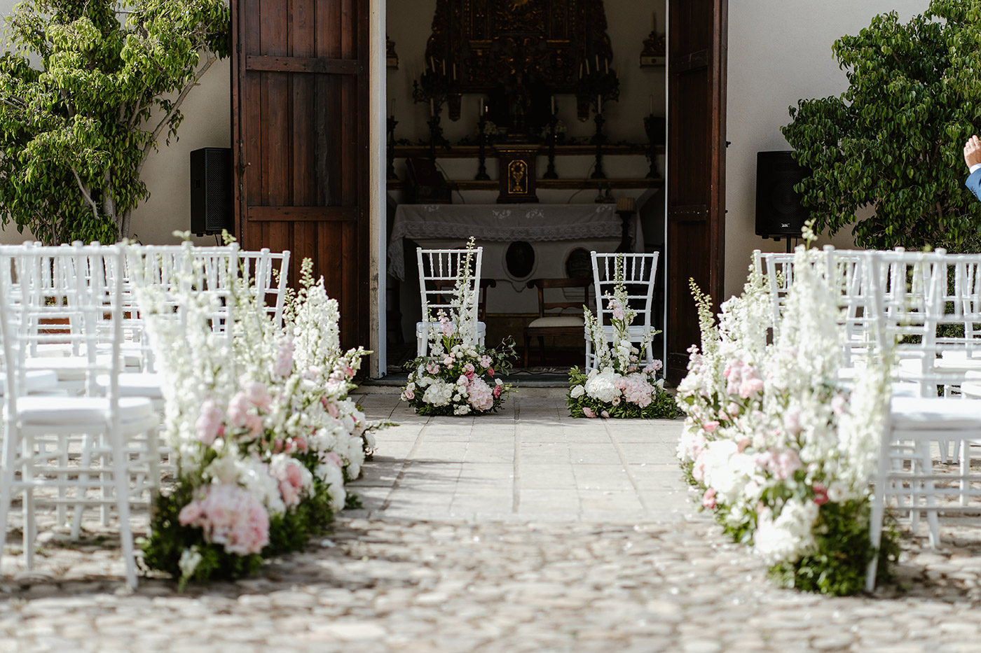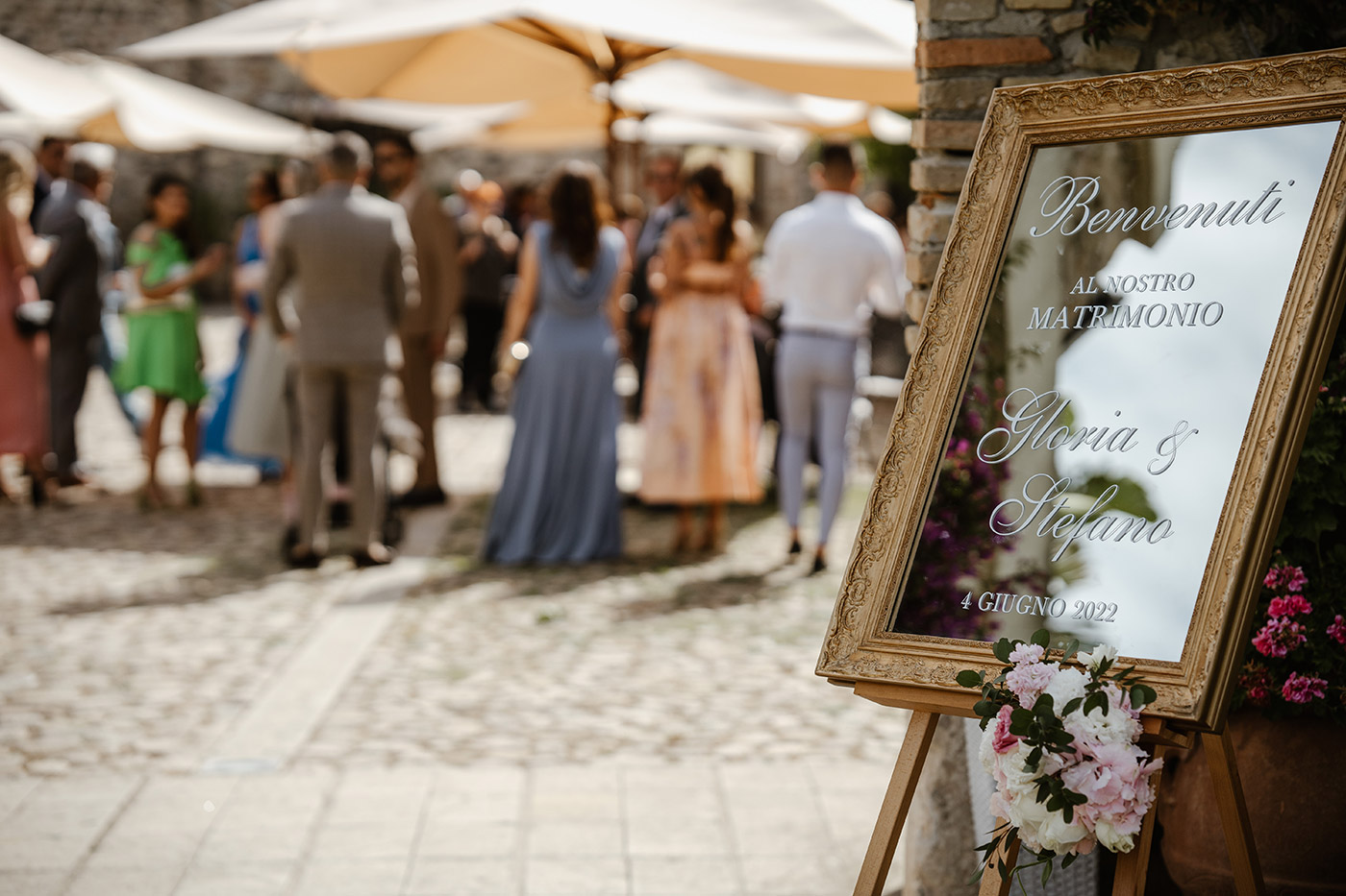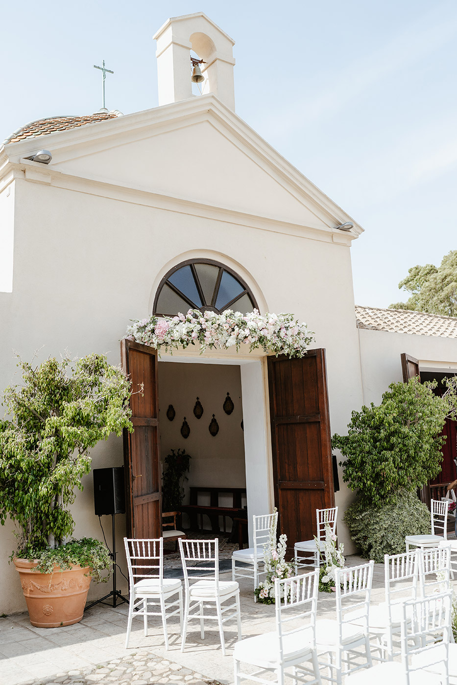 La cerimonia religiosa si è svolta nella cappella intima della tenuta, seguita da un elegante aperitivo nel giardino e da una cena raffinata nella sala interna.